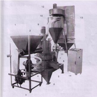 1、進(jìn)料倉(cāng) 2、螺旋進(jìn)料器 3、減速機(jī) 4、鼓風(fēng)機(jī) 5、主機(jī) 6、機(jī)架 7、冷卻水管接頭 8、進(jìn)風(fēng)落料口 9、分級(jí)機(jī)總成 10、旋風(fēng)分離器 11、關(guān)風(fēng)機(jī) 12、風(fēng)機(jī) 13、除塵箱 14、電控柜