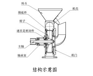 該機主要由機殼、機門、渦輪、主軸、篩網等組成。機殼兩端配以滾動軸承支撐主軸,由電動機通過帶傳動,帶動主軸及緊固在主軸上的渦輪高速旋轉。渦輪與篩網圈上的磨塊,組成合理、緊湊的結構,使進入機器的物料,在旋轉氣流中緊密地摩擦和沖擊,發生在渦輪的葉片內邊上,并在葉片與磨塊之間的隙縫中,進行再次研磨,在這過程中,渦輪吸進大量的空氣,起到了冷卻機器磨料,傳送細粉的目的。實際獲得粉碎的細度,還取決于預定物料,篩孔形狀和尺寸,以及物料和空氣的通過量。