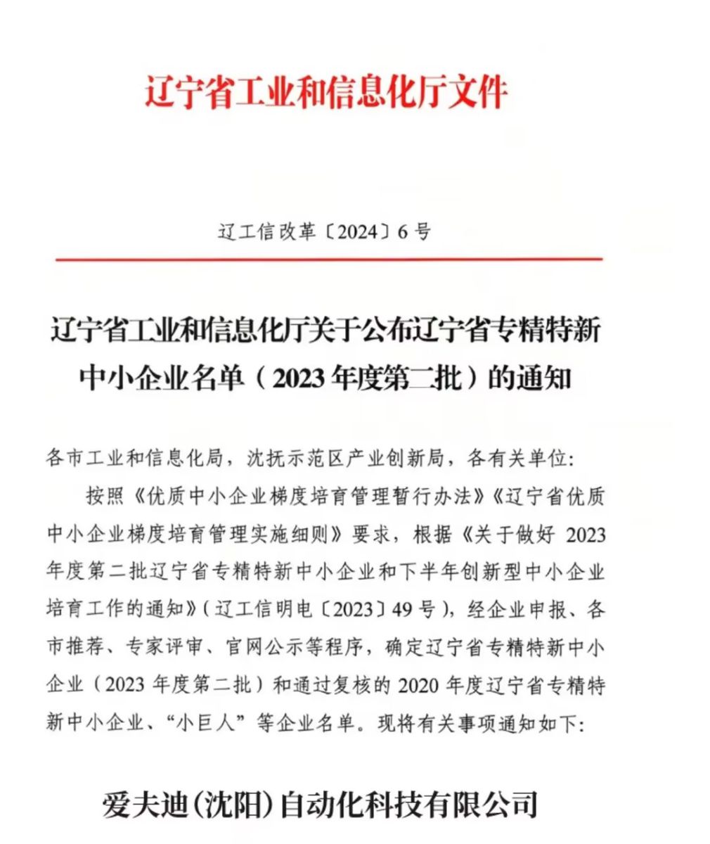日前,遼寧省工業和信息化廳對遼寧省專精特新中小企業名單進行了公示,愛夫迪(沈陽)自動化科技有限公司(以下簡稱“愛夫迪沈陽”)經過沈陽市工信局初審推薦并經專家組評審等程序后,正式通過了認定工作,并榮獲2023年度“遼寧省專精特新中小企業”稱號。